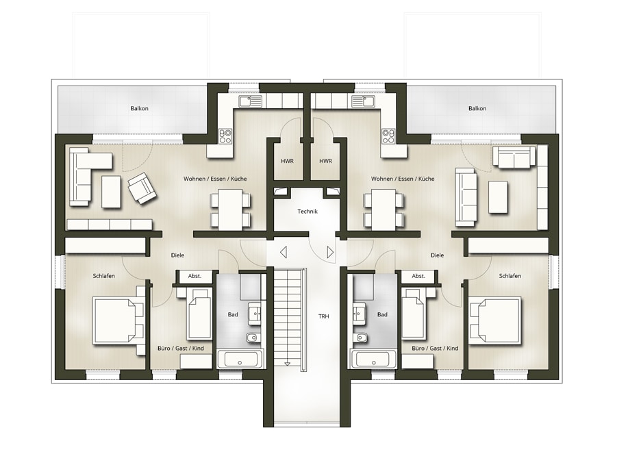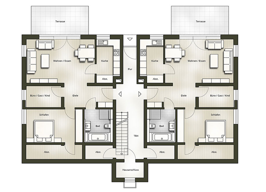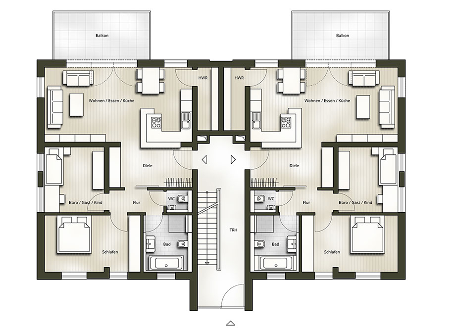 - Zwei Mehrfamilienhäuser mit jeweils 6 Parteien auf 3 Ebenen mit modernem Pultdach